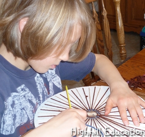 The circular loom was created in a similar manner. There is a small hole in the center of the cardboard circle.